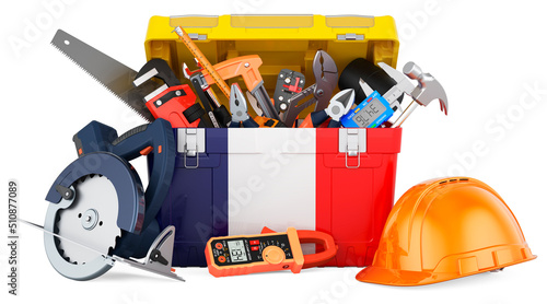 French flag painted on the toolbox. Service, repair and construction in France, concept. 3D rendering