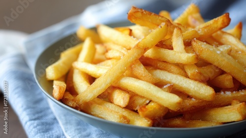 french fries close up, golden crispy fries, lightly salted, served in simple bowl, everyday home dining style