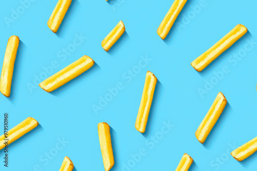 French fries. Seamless pattern with roasted potato chips in deep fat . Fry oil potatoes. Yellow sticks on blue background.