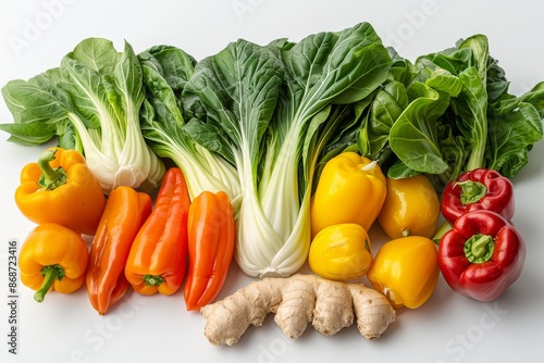 Fresh and colorful Chinese vegetables on a clean white background, including bok choy, bell peppers, and ginger, arranged neatly to showcase their freshness and vibrancy.