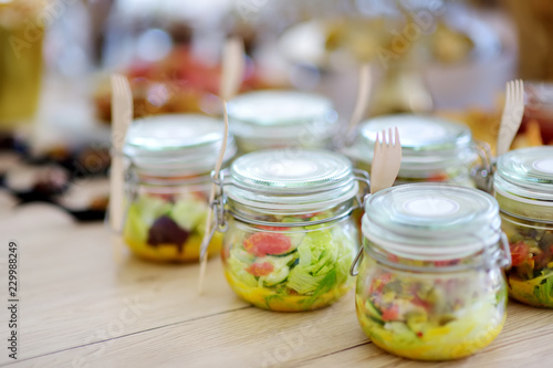 Fresh and delicious vegetable salad served in mini jars on a party or wedding reception.