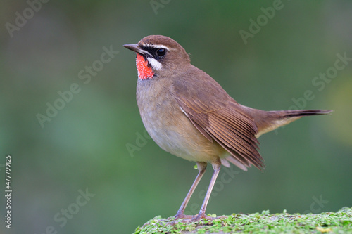 fresh and happy nature, brown bird with red marking on its chin expose over green duck weed and blur background having tail wagging
