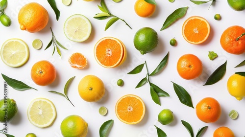 Fresh and juicy citrus fruits arranged as a pattern in top view on white background