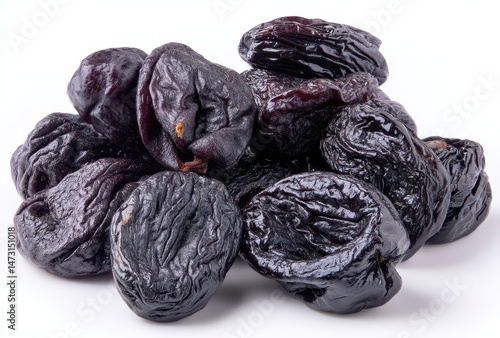 Fresh and Juicy Prunes Piled Together on a White Background with Natural Shine and Rich Color for Healthy Snacking and Nutritional Benefits