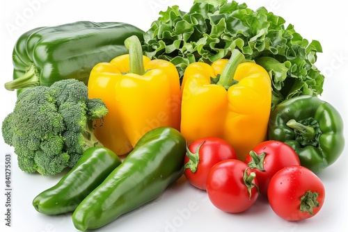 Fresh and vibrant assortment of bell peppers, broccoli, and tomatoes, beautifully presented in a natural and healthy setting