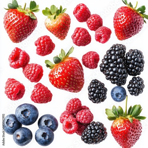 Fresh and Vibrant Assortment of Berries Including Strawberries, Raspberries, Blackberries, and Blueberries on White Background