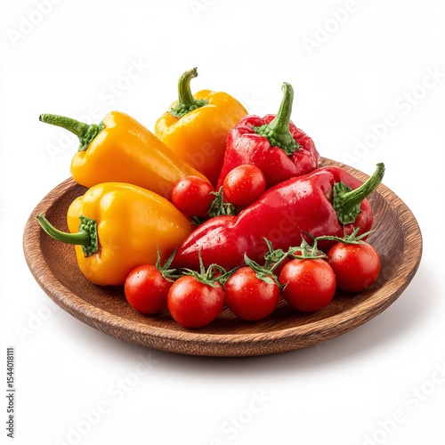 Fresh and vibrant bell peppers and cherry tomatoes arranged on a wooden plate, a delicious and colorful culinary scene.