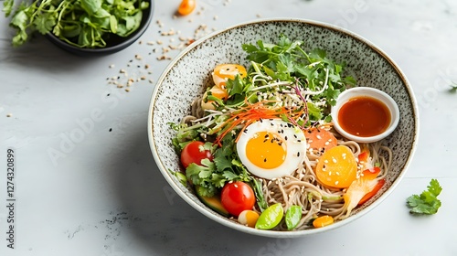 Fresh and Vibrant Bowl of Noodle Salad with Vegetables and Boiled Egg on a Rustic Background