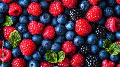 Fresh and Vibrant Collection of Ripe Raspberries Blueberries and Blackberries with Green Mint Leaves