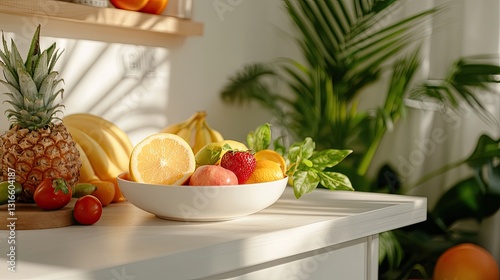 Fresh and Vibrant Fruits Displayed in a Sunlit Kitchen Environment