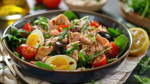 Fresh and Vibrant Salad Bowl with Salmon, Eggs, and Cherry Tomatoes