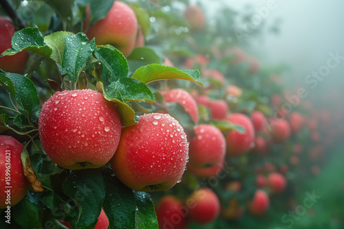 Fresh apples on tree glistening with water droplets.