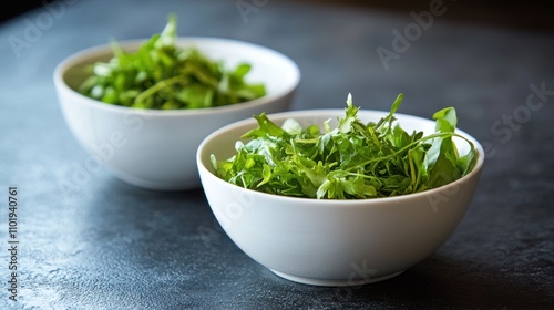 Fresh Arugula Salad in White Bowls Ready To Eat