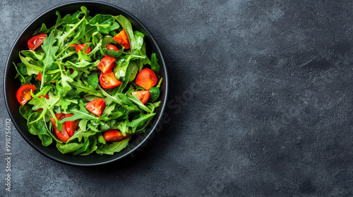 Fresh arugula salad with cherry tomatoes, vibrant greens, and modern black bowl, perfect for healthy meal. Enjoy crisp textures and flavors!