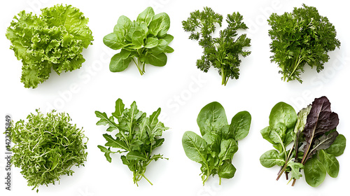 Fresh assorted greens on white background including lettuce spinach and herbs arranged in a flat lay style