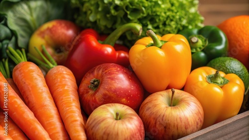 Fresh assortment of colorful vegetables and fruits arranged in a wooden crate, showcasing a healthy and vibrant selection.