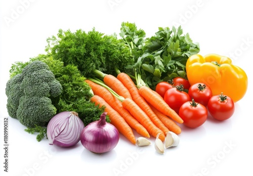 Fresh Assortment of Organic Vegetables Including Broccoli, Carrots, Tomatoes, Bell Pepper, Onions, and Herbs on White Background for Healthy Lifestyle and Nutrition