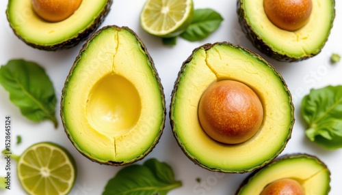 Fresh Avocado Halves Surrounded by Lime Slices and Fresh Basil Leaves for Healthy Culinary Inspiration and Nutrition
