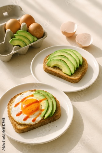 Fresh avocado toast with eggs on plates in sunlit kitchen setting