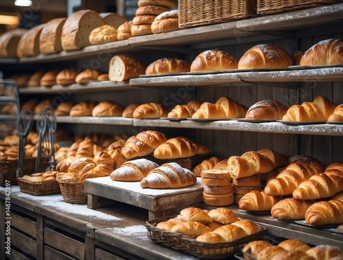 Fresh Baked Bread and Croissants on Shelves at a Bakery