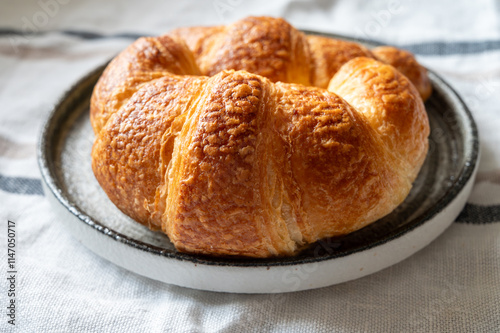 Fresh baked two buttered croissants served in restaurant for continental or French breakfast close up