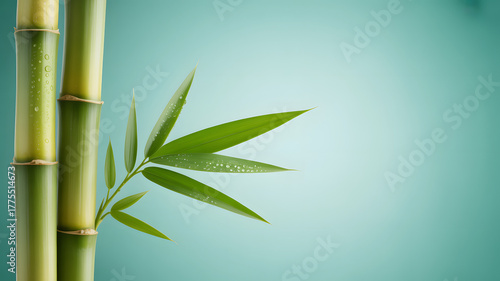 Fresh Bamboo Stalks and Leaves with Water Droplets Against a Soft Teal Background, Spa and Wellness Concept