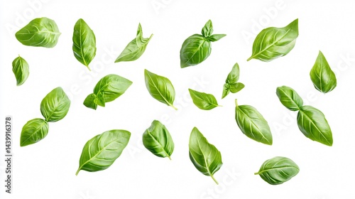 Fresh Basil Herb Leaves Flying on White Background