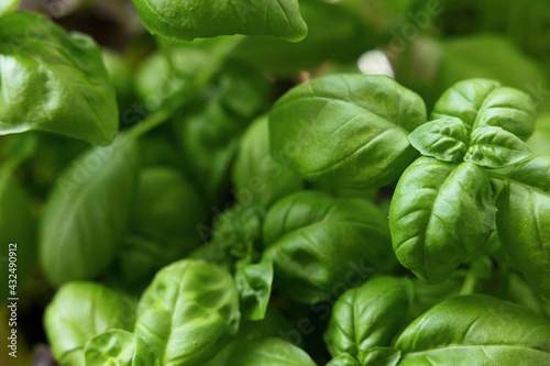 Fresh basil leaves on a dark ground background. Green basil. A lot of flavored basil. Classic herbs for salads and sauces of Italian and French cuisine. Close up selected focus. Top view