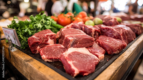 Fresh beef cuts displayed on a simple wooden table at a traditional market, Ai generated images.