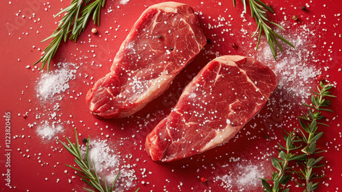Fresh beef steaks on red background with herbs and salt, perfect for cooking. vibrant colors and textures create appetizing display for meat lovers