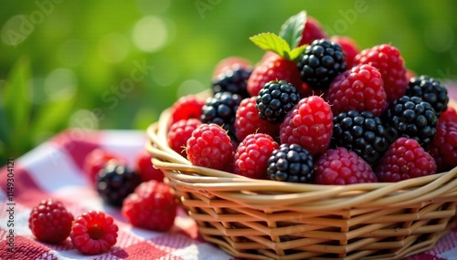 Fresh blackberries and raspberries piled high in a basket, picnic, harvest, raspberry