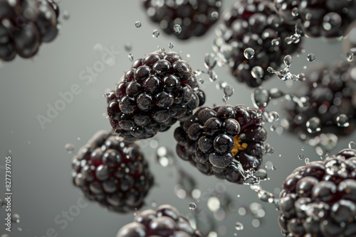 Fresh Blackberries with Water Splash in Mid Air Isolated on Gray Background