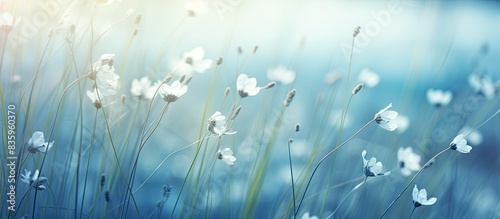 fresh blooming grass flower in garden in soft blue tone. Creative banner. Copyspace image