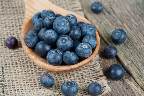 fresh blueberries in a wooden spoon over wooden table