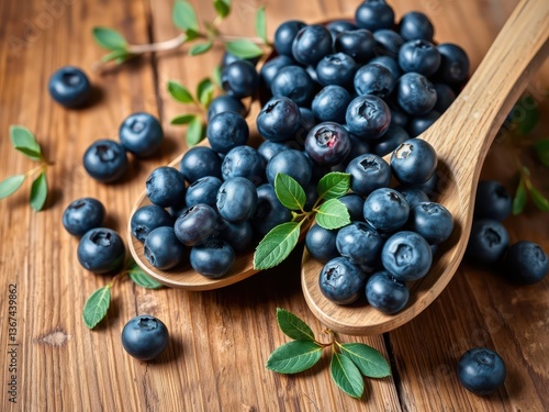 Fresh Blueberries in Wooden Spoons on Wooden Table