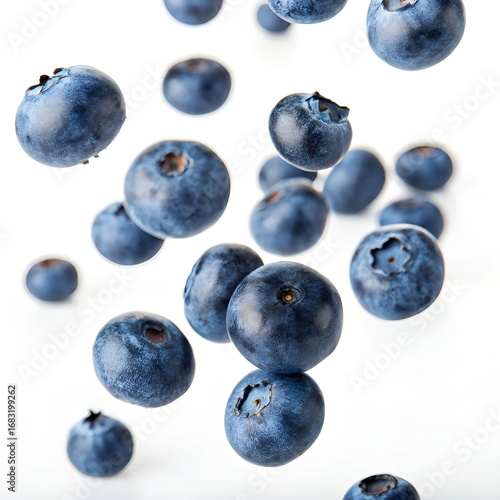 Fresh blueberries levitate and scatter midair against a clean white backdrop.