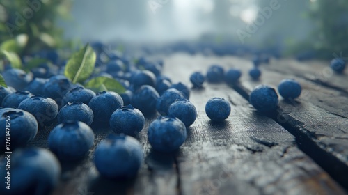 Fresh blueberries on rustic wood, misty forest background; food, recipe, nature