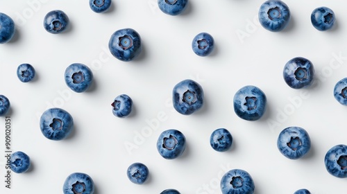 Fresh blueberries scattered on a white background, with some cut in half revealing juicy interiors and small seeds. Detailed texture emphasized