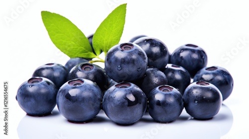 Fresh blueberries with green leaves arranged on a white surface in a bright, natural setting