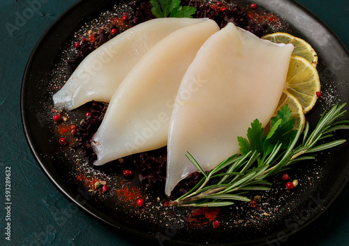 Fresh body, squid, raw, three carcasses, top view, no people , on a plate,