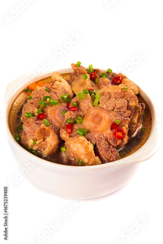 Fresh Braised Oxtail Beef Stew with Vegetables and Herbs in White Bowl