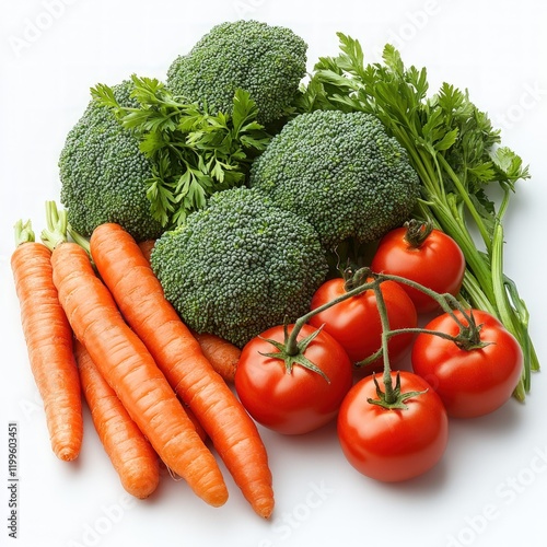 Fresh broccoli, carrots, tomatoes, and parsley.