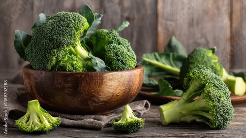Fresh Broccoli Feast: A rustic wooden bowl overflowing with vibrant broccoli florets sits amidst a display of fresh produce.