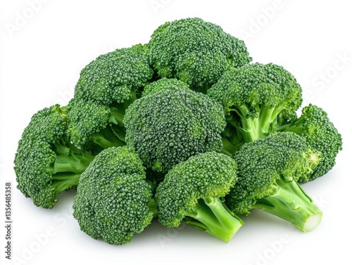 Fresh broccoli florets piled high against a white background showcasing vibrant green color and healthy food choice for balanced diet