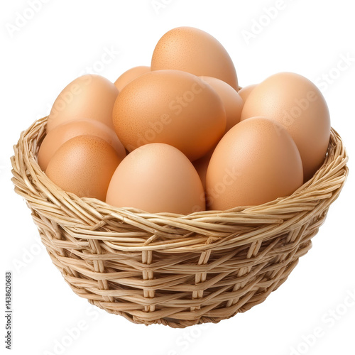 Fresh brown eggs arranged neatly in a woven basket on a clean surface in a sunny kitchen setting