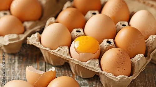 Fresh Brown Eggs in Carton with One Cracked Open Showing Yolk