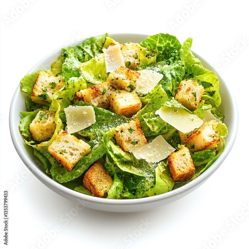 Fresh Caesar salad in bowl with croutons and parmesan.