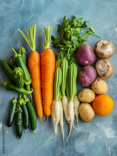 Fresh carrot, okra, green carrot, sweet potato, mushroom, potato, purple potato, blue sky background