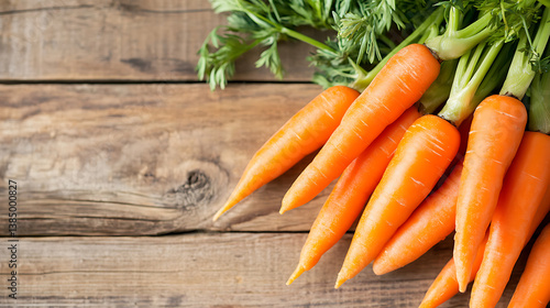 Fresh carrots are vibrant orange and arranged neatly on rustic wooden surface, showcasing their natural beauty and freshness. These healthy vegetables are perfect for snacking or adding to meals