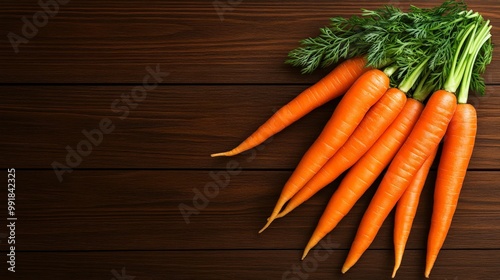 Fresh Carrots on Wooden Background: A bunch of fresh, vibrant carrots with green tops lie on a rustic wooden surface, capturing the essence of natural goodness and healthy eating.